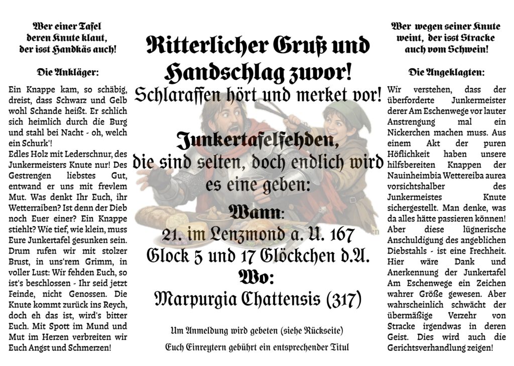 Ritterlicher Gruß und Handschlag zuvor! Schlaraffen hört und merket vor! Am 25. im Hornung a. U. 166 haben zwei Sassen der Junkertafel Nauinheimbia Wettereiba aurea (247) die Knute des Junkermeisters derer am Eschenwege gestohlen – dies bleibt nicht ohne Sühne – wir fehden Euch Ihr Wettereibaen!